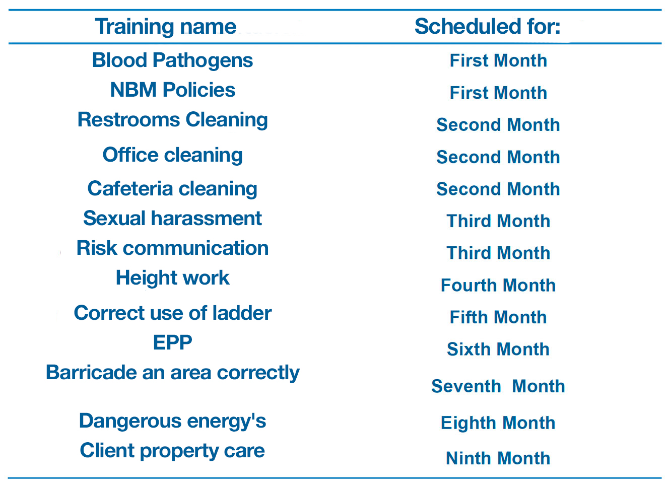 This being one of our main pillars, in National Building Maintenance CO, we are concerned that our staff has an annual training program and that they receive feedback for each period.
